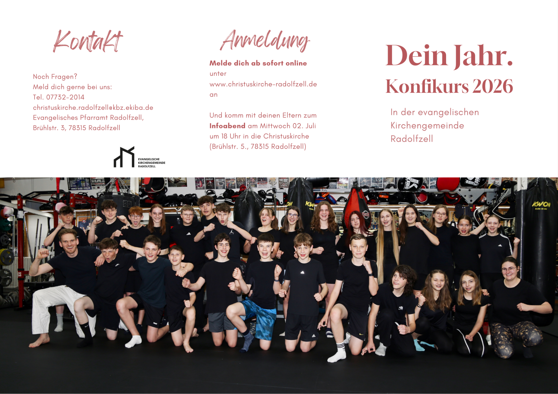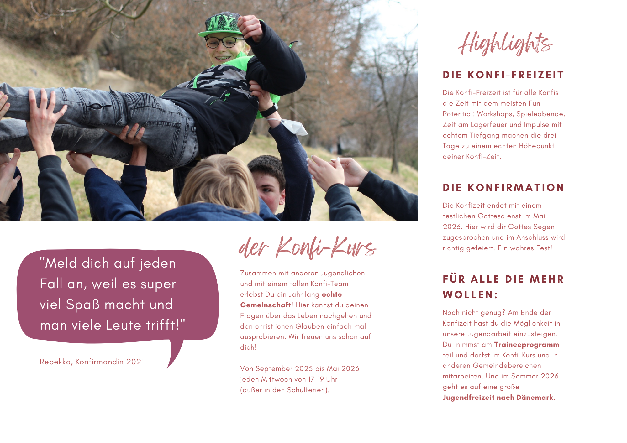 Der Konfikurs findet von September 2025 bis Mai 2026 jeden Mittwoch von 17-19 Uhr statt (außer in den Schulferien). Eingeladen sind alle Jugendlichen, die im September 2025 in die 8. Klasse kommen oder im Laufe des Schuljahres 2025-26 14 Jahre alt werden. Aber auch wer schon älter ist und noch nicht konfirmiert kann sich konfirmieren lassen.
